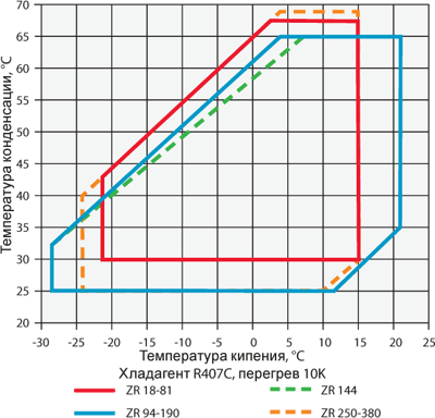 Рабочий диапазон спиральных герметичных компрессоров Copeland серии ZR с хладагентом - R407C: